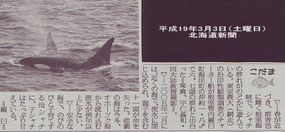 ・平成20年3月23日 毎日新聞 「シャチ 子育ての群れ確認 北海道・羅臼」